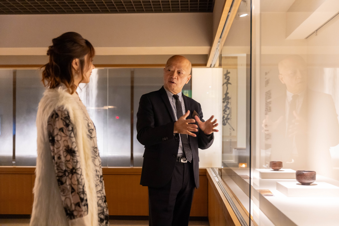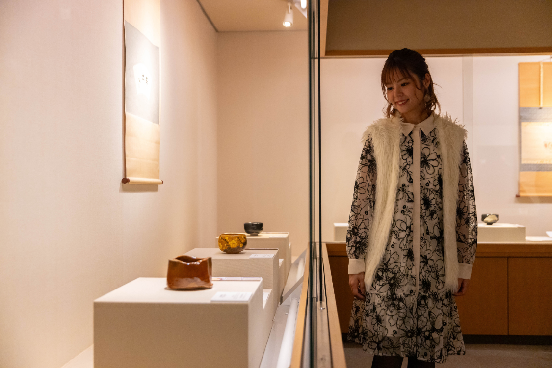 今回は、十一代大樋長左衛門(年雄)氏のナビゲートのもと、大樋美術館を巡る貴重な体験をさせていただきました。初代長左衛門から当代までの大樋焼作品や、加賀藩に縁の深い茶道具が展示されており、さらに大樋家と関わりの深い文化人たちが遺した作品や資料を鑑賞できる特別な時間。各作品が生まれた背景や作者の人柄についても詳しく説明いただき、面白いエピソードも満載でした。そして、ここだけのスペシャルな体験が、茶室「年々庵」での呈茶体験。歴代の大樋長左衛門作の茶盌の中から、好きなものを選び、実際に手に取って使用できる贅沢な機会です。その重厚感ある見た目とは裏腹に、手にしっくりと馴染み、抹茶をいただく際の口当たりの柔らかさに驚きました。