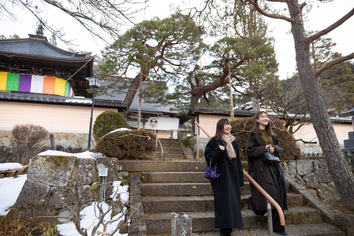 十二代目の住職から、姿勢と呼吸の大切さや作法についてお話を聞いた後、実際に座禅に挑戦。両膝を地面に降ろし、三点で体を支えることで呼吸が通りやすくなり、頭の中もだんだんとスッキリ!丹田に意識を集中させることで、心のざわつきが外へと流れ出ていくのを感じました。警策(きょうさく)を受けることもでき、自分の心の変化に気づき、浄化されていく感覚も味わえました。