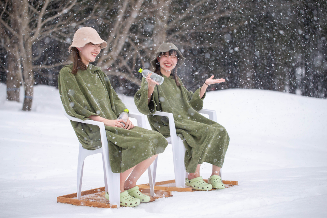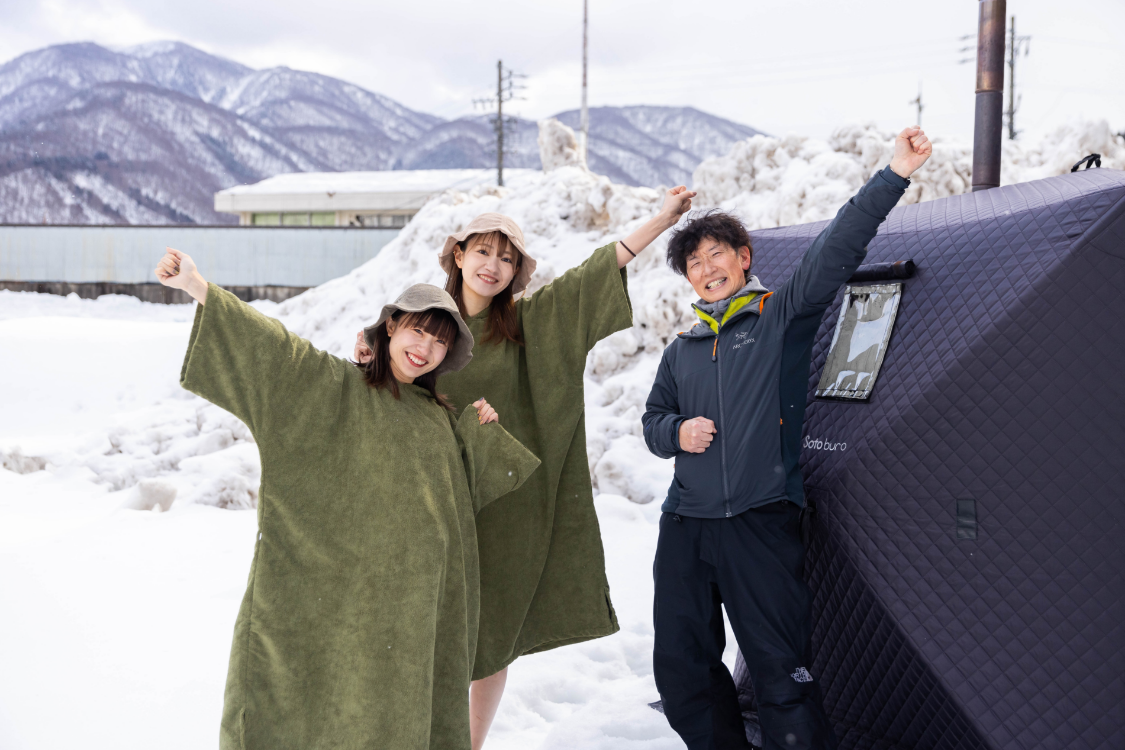 サウナウェアに着替えてテントに入ると、すでに100度近くまで上昇しており、冷えきった体をじんわり温めてくれます。そしてこの季節ならではの、水風呂ではなく雪ダイブ!最初は少し躊躇しましたが、何度か繰り返すうちに、心も体も解放されていきました。白山の雪解け水を使用したロウリュウも、体感温度を一層引き上げてくれ汗が止まりません!